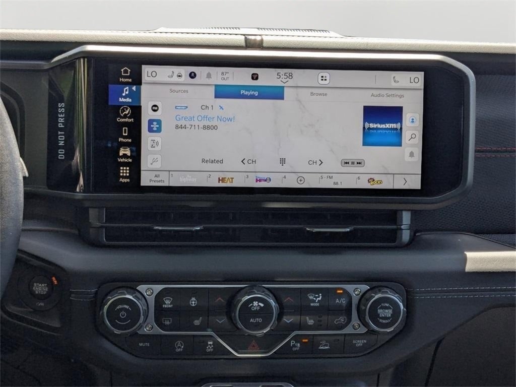 Gladiator Rubicon, 4D Crew Cab, 3.6L V6 24V VVT, 8-Speed Automatic, 4WD, Mojito, Black Leather, 12.3 Touchscreen Display, 4-Wheel Disc Brakes, 4.10 Rear Axle Ratio, 4G LTE Wi-Fi Hot Spot, 8 Speakers, 97 MPH Vehicle Max Speed Calibration, ABS brakes, Air Conditioning, Alexa Built-In, Alloy wheels, AM/FM radio: SiriusXM, Apple CarPlay, Apple CarPlay/Android Auto, Auto High Beam Headlamp Control, Automatic temperature control, Blind Spot & Cross Path Detection, Brake assist, Cloth Low-Back Bucket Seats, Compass, Connectivity - US/Canada, Convenience Group, Delay-off headlights, Driver door bin, Driver vanity mirror, Dual front impact airbags, Dual front side impact airbags, Electronic Stability Control, Emergency communication system: Jeep Connect, Freedom Panel Storage Bag, Front anti-roll bar, Front Bucket Seats, Front Center Armrest w/Storage, Front dual zone A/C, Front fog lights, Front reading lights, Full Length Floor Console Premium Armrest, Fully automatic headlights, Google Android Auto, Heated door mirrors, Heated Front Seats, Heated Steering Wheel, Illuminated entry, Integrated roll-over protection, Leather Wrapped Park Brake Handle, Leather Wrapped Shift Knob, Low tire pressure warning, MOPAR All-Weather Slush Mats, MOPAR Tool Kit JPP/Jeep, Occupant sensing airbag, Outside temperature display, Overhead airbag, Panic alarm, ParkSense Rear Park Assist System, Passenger door bin, Passenger vanity mirror, Performance Suspension, Power 4-Way Driver Lumbar Adjust, Power 4-Way Passenger Lumbar Adjust, Power Adjust 8-Way Driver Seat, Power Adjust 8-Way Front Passenger Seat, Power Adjust Nappa Leather Seats, Power door mirrors, Power steering, Power windows, Premium Door Trim Panel, Quick Order Package 24R Rubicon, Radio data system, Radio: Uconnect 5 w/12.3 Display, Rear anti-roll bar, Rear Armrest w/Cupholder Seat, Rear reading lights, Rear Sliding Window, Rear Window Defroster, Remote keyless entry, Remote Start System, Safety Group, Security system, SiriusXM Radio Service, SiriusXM w/360L, Speed control, Split folding rear seat, Steering wheel mounted audio controls, Tachometer, TAN 3-Piece Hard Top, Telescoping steering wheel, Tilt steering wheel, Traction control, Trip computer, Universal Garage Door Opener, USB Host Flip, Variably intermittent wipers, Voltmeter, Wheels: 17 x 7.5 Machined w/Black Pockets, Wheels: 17 x 7.5 Machined/Painted Black, Gladiator Rubicon, 4D Crew Cab, 3.6L V6 24V VVT, 8-Speed Automatic, 4WD, Mojito, Black Leather.