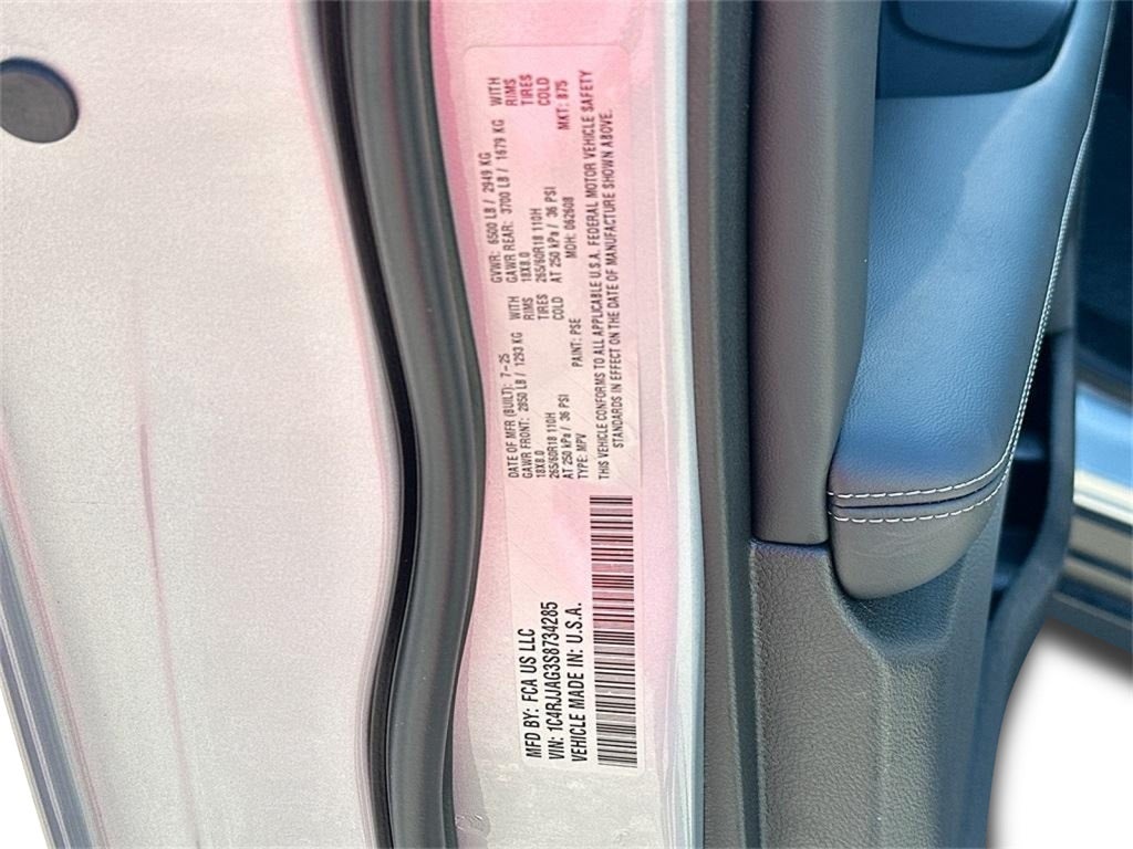 Grand Cherokee L Altitude X, 4D Sport Utility, 3.6L V6 24V VVT, 8-Speed Automatic, RWD, Silver Zynith, Global Black Artificial Leather, 115V Auxiliary Power Outlet, 180 Amp Alternator, 2nd Row 60/40 Bench w/Manual Tip/Slide, 2nd Row Seat Center Armrest/Cupholders, 3 Rear Seat Head Restraints, 3.45 Rear Axle Ratio, 3rd Row Charge-Only USB Ports, 3rd row seats: split-bench, 4-Wheel Disc Brakes, 6 Speakers, 7 & 4 Pin Wiring Harness, 7-Passenger Seating, ABS brakes, Air Conditioning, Alloy wheels, Altitude X, AM/FM radio: SiriusXM, Anti-whiplash front head restraints, Automatic Headlamp Leveling System, Automatic temperature control, Black Headliner, Brake assist, Bumpers: body-color, Capri Leatherette/Suede Seats, Center Rear 3-Point Seat Belt, Class IV Receiver Hitch, Cloth Seats, Compass, Delay-off headlights, Delete Laredo Badge, Driver door bin, Driver vanity mirror, Dual Exhaust Tips, Dual front impact airbags, Dual front side impact airbags, Electronic Stability Control, Emergency communication system, Four wheel independent suspension, Front anti-roll bar, Front Bucket Seats, Front Center Armrest w/Storage, Front dual zone A/C, Front reading lights, Fully automatic headlights, Gloss Black Exterior Accents, Heated door mirrors, Heated Front Seats, Heated Steering Wheel, Heavy-Duty Engine Cooling, Illuminated entry, Knee airbag, Low tire pressure warning, Manual Fold Seatbacks, Model Year Tracking, Normal Duty Suspension, Occupant sensing airbag, Outside temperature display, Overhead airbag, Overhead console, Panic alarm, ParkView Rear Back-Up Camera, Passenger door bin, Passenger vanity mirror, Power door mirrors, Power driver seat, Power Liftgate, Power steering, Power Sunroof, Power windows, Quick Order Package 23M Altitude X, Radio data system, Radio: Uconnect 5 w/8.4 Display, Rain Sensitive Windshield Wipers, Rear air conditioning, Rear anti-roll bar, Rear Load Leveling Suspension, Rear reading lights, Rear window defroster, Rear window wiper, Reclining 3rd row seat, Remote keyless entry, Remote Start System, Security system, Selectable Tire Fill Alert, Speed control, Speed-Sensitive Wipers, Split folding rear seat, Spoiler, Steering wheel mounted audio controls, Tachometer, Telescoping steering wheel, Tilt steering wheel, Traction control, Trailer Hitch Zoom, Trailer Tow Package, Trip computer, Variably intermittent wipers, Voltmeter, Wheels: 18 x 8.0 Fully Painted Aluminum, Wheels: 18 x 8.0 Fully Painted Aluminum 1, Wireless Charging Pad, Grand Cherokee L Altitude X, 4D Sport Utility, 3.6L V6 24V VVT, 8-Speed Automatic, RWD, Silver Zynith, Global Black Artificial Leather.