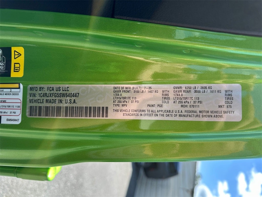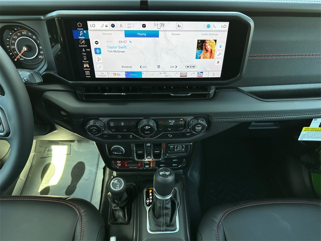 Wrangler Rubicon, 4D Sport Utility, 3.6L V6 24V VVT, 8-Speed Automatic, 4WD, Mojito Clearcoat, Black Leather, 12.3 Touchscreen Display, 35 Tire Suspension, 4-Wheel Disc Brakes, 4G LTE Wi-Fi Hot Spot, 8 Speakers, 97 MPH Vehicle Max Speed Calibration, ABS brakes, Adaptive Cruise Control w/Stop, Air Conditioning, Alloy wheels, Alpine Premium Audio System, AM/FM radio: SiriusXM, Anti-Lock 4-Wheel Disc Perf Brakes, Apple CarPlay, Apple CarPlay/Android Auto, Auto High Beam Headlamp Control, Auto-Dimming Rear-View Mirror, Automatic temperature control, Aux Battery, Auxiliary Switches, Black Vinyl Floor Covering, Blind Spot & Cross Path Detection, Body Color Rubicon Highline Flare, Brake assist, Cargo Compartment Dress-Up, Class II Receiver Hitch, Cloth Low-Back Bucket Seats, Compass, Connected Travel & Traffic Services, Connectivity - US/Canada, Convenience Group, Delay-off headlights, Driver door bin, Driver vanity mirror, Dual front impact airbags, Dual front side impact airbags, Electronic Stability Control, Emergency communication system: Jeep Connect, Front anti-roll bar, Front Bucket Seats, Front Center Armrest w/Storage, Front dual zone A/C, Front fog lights, Front reading lights, Fully automatic headlights, Google Android Auto, GPS Navigation, HD Radio, Heated door mirrors, Heated Front Seats, Heated Steering Wheel, Illuminated entry, Integrated Off-Road Camera, Integrated Radar Camera Module (IRCM), Integrated roll-over protection, Integrated Voice Command w/Bluetooth®, Leather Wrapped Park Brake Handle, Leather Wrapped Shift Knob, Low tire pressure warning, MOPAR Hinge-Gate Reinforcement, Nappa Leather Seats, Non-Lock Fuel Cap w/o Discriminator, Occupant sensing airbag, Outside temperature display, Overhead airbag, Panic alarm, ParkSense Rear Park Assist System, ParkView Rear Back-Up Camera, Passenger door bin, Passenger vanity mirror, Performance Suspension, Power 4-Way Driver Lumbar Adjust, Power 4-Way Passenger Lumbar Adjust, Power Adjust 8-Way Driver Seat, Power Adjust 8-Way Front Passenger Seat, Power door mirrors, Power steering, Power Top Quarter Window Storage Bag, Power windows, Premium Door Trim Panel, Quick Order Package 24R Rubicon, Radio data system, Radio: Uconnect 5 Nav w/12.3 Display, Radio: Uconnect 5 w/12.3 Display, Rear anti-roll bar, Rear reading lights, Rear Window Defroster, Rear Window Wiper/Washer, Remote keyless entry, Removable Rear Quarter Windows, Safety Group, Security system, SiriusXM Radio Service, SiriusXM w/360L, Sky 1-Touch Power Top, Speed control, Split folding rear seat, Steering wheel mounted audio controls, Stop-Start Dual Battery System, Tachometer, Technology Group, Telescoping steering wheel, Tilt steering wheel, Traction control, Trip computer, Universal Garage Door Opener, Variably intermittent wipers, Voltmeter, Wheel Flare Extensions, Wheels: 17 x 7.5 Machined/Painted Black, Wheels: 17 x 8 Machined w/Black Pockets, Xtreme 35 Tire Package, Wrangler Rubicon, 4D Sport Utility, 3.6L V6 24V VVT, 8-Speed Automatic, 4WD, Mojito Clearcoat, Black Leather.