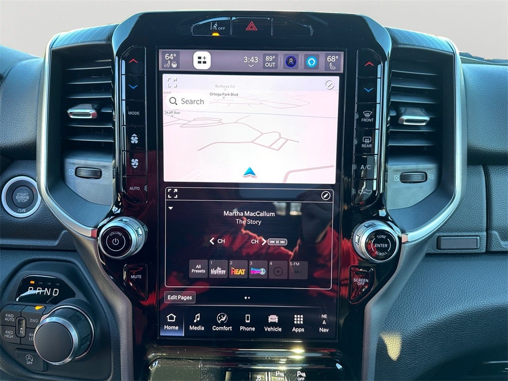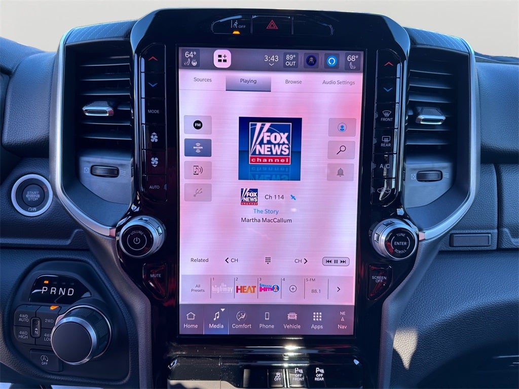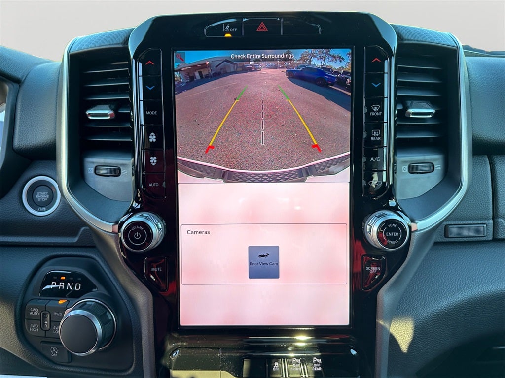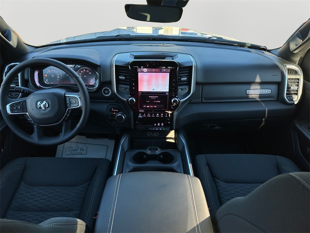 Big Horn Level 2 Equipment Group (115V Auxiliary Power Outlet, 115V Auxiliary Rear Power Outlet, 12 Touchscreen Display, 2nd Row in Floor Storage Bins, 3 Rear Seat Head Restraints, 4 Way Front Headrests, 400W Inverter, 4G LTE Wi-Fi Hot Spot, 9 Amplified Speakers with Subwoofer, Air Conditioning ATC with Dual Zone Control, Apple CarPlay, Auto Power-Folding Mirrors, Auto-Dimming Exterior Driver Mirror, Auto-Dimming Rear-View Mirror, Black Exterior Mirrors, Black Premium Power Mirrors, Body Color Fender Flares, Bucket Seats, Center Console Parts Module, Cluster 7.0 TFT Color Display, Configurable Drive Mode, Connected Travel and Traffic Services, Connectivity - US/Canada, Convex Wide-Angle Exterior Mirror Insert, Deluxe Cloth Bucket Seats, Disassociated Touchscreen Display, Exterior Mirrors Courtesy Lamps, Exterior Mirrors with Heating Element, Exterior Mirrors with Supplemental Signals, Front Seat Back Map Pockets, Full Length Floor Console, Global Telematics Box Module, Glove Box Lamp, Google Android Auto, GPS Antenna Input, GPS Navigation, HD Radio, Heated Front Seats, Heated Steering Wheel, Integrated Center Stack Radio, Integrated Voice Command with Bluetooth®, Leather Wrapped Steering Wheel, LED Dome Lamp with on/Off Switch, LED Footwell Lighting, Manual Adjust 4-Way Front Passenger Seat, Media Hub with 2 Charge Only USBs, Overhead LED Lamps, Power 2-Way Driver Lumbar Adjust, Power Adjust 8-Way Driver Seat, Power Adjustable Pedals, Premium Overhead Console, Radio: Uconnect 5 Navigation with 12.0 Display, Rear 60/40 Folding Seat, Rear Center Armrest, Rear Power Sliding Window, Rear Window Defroster, Remote Tailgate Release, Security Alarm, SiriusXM Radio Service, SiriusXM with 360L, Steering Wheel Mounted Audio Controls, Sun Visors with Illuminated Vanity Mirrors, Universal Garage Door Opener, and USB Host Flip), Night Edition (Accent Color Door Handles, Accent Color Premium Power Mirrors, Accent Color Tailgate Handle, Anti-Spin Differential Rear Axle, Black Exterior Truck Badging, Black Headlamp Bezels, Black Interior Accents, Black Painted Exterior Mirrors Caps, Black Tail Lamp Bezels, Body Color Front Bumper, Body Color Rear Bumper with Step Pads, Dual Exhaust with Black Tips, Grille Black Surround Black Mesh, RAM Grille Badge - Black, and Wheels: 20 x 9.0 Aluminum Painted Clad), Quick Order Package 27Z Big Horn, 4-Wheel Disc Brakes, 48V Belt Starter Generator, 6 Speakers, ABS brakes, Air Conditioning, Alloy wheels, AM/FM radio, Apple CarPlay/Android Auto, Auto High-beam Headlights, Brake assist, Bumpers: chrome, Cloth Bucket Seats, Cluster 12 TFT Color Display, Compass, Delay-off headlights, Driver door bin, Dual front impact airbags, Dual front side impact airbags, Electronic Stability Control, Front anti-roll bar, Front Bucket Seats, Front Center Armrest w/Storage, Front fog lights, Front reading lights, Front wheel independent suspension, Fully automatic headlights, Heated door mirrors, Illuminated entry, Low tire pressure warning, Manual Adjust 4-Way Driver Seat, Manual Folding Exterior Mirrors, MOPAR Front and Rear Rubber Floor Mats, Occupant sensing airbag, Outside temperature display, Overhead airbag, Overhead console, Panic alarm, ParkView Rear Back-Up Camera, Passenger door bin, Passenger vanity mirror, Power door mirrors, Power steering, Power windows, Radio data system, Radio: Uconnect 5 W with 8.4 Display, RAM Grille Badge - Chrome, Rear anti-roll bar, Rear step bumper, Remote keyless entry, Speed control, Supplier Part Tracking (J-1), Tachometer, Telescoping steering wheel, Tilt steering wheel, Traction control, Trip computer, Variably intermittent wipers, and Voltmeter.