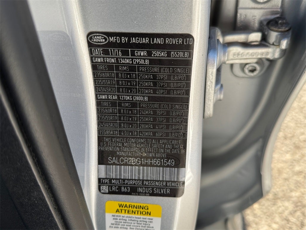 Discovery Sport HSE, 4D Sport Utility, 2.0L I4 Turbocharged, 9-Speed Automatic, 4WD, Silver, Ebony Leather, 10 Speakers, 10-Way Power Front Seats w/Memory, 3.75 Axle Ratio, 4-Wheel Disc Brakes, ABS brakes, Air Conditioning, Alloy wheels, AM/FM radio, Auto-dimming Rear-View mirror, Automatic temperature control, Brake assist, Bumpers: body-color, Delay-off headlights, Driver door bin, Driver vanity mirror, Dual front impact airbags, Dual front side impact airbags, Electronic Stability Control, Emergency communication system: InControl Protect, Exterior Parking Camera Rear, Four wheel independent suspension, Front anti-roll bar, Front Bucket Seats, Front Center Armrest, Front dual zone A/C, Front fog lights, Front reading lights, Fully automatic headlights, Garage door transmitter: HomeLink, Grained Leather Seat Trim, Headlight cleaning, Heated door mirrors, High intensity discharge headlights: Bi-Xenon, Illuminated entry, Knee airbag, Leather steering wheel, Low tire pressure warning, Memory seat, Occupant sensing airbag, Outside temperature display, Overhead airbag, Panic alarm, Passenger door bin, Passenger vanity mirror, Power door mirrors, Power driver seat, Power Liftgate, Power passenger seat, Power steering, Power windows, Radio data system, Radio: 190W Audio System w/10 Speakers, Rain sensing wipers, Rear anti-roll bar, Rear fog lights, Rear reading lights, Rear seat center armrest, Rear window defroster, Rear window wiper, Remote keyless entry, Security system, Speed control, Speed-sensing steering, Speed-Sensitive Wipers, Split folding rear seat, Spoiler, Steering wheel mounted audio controls, Tachometer, Telescoping steering wheel, Tilt steering wheel, Traction control, Trip computer, Turn signal indicator mirrors, Variably intermittent wipers, Wheels: 18 5 Split Spoke Sparkle Silver, Discovery Sport HSE, 4D Sport Utility, 2.0L I4 Turbocharged, 9-Speed Automatic, 4WD, Silver, Ebony Leather.