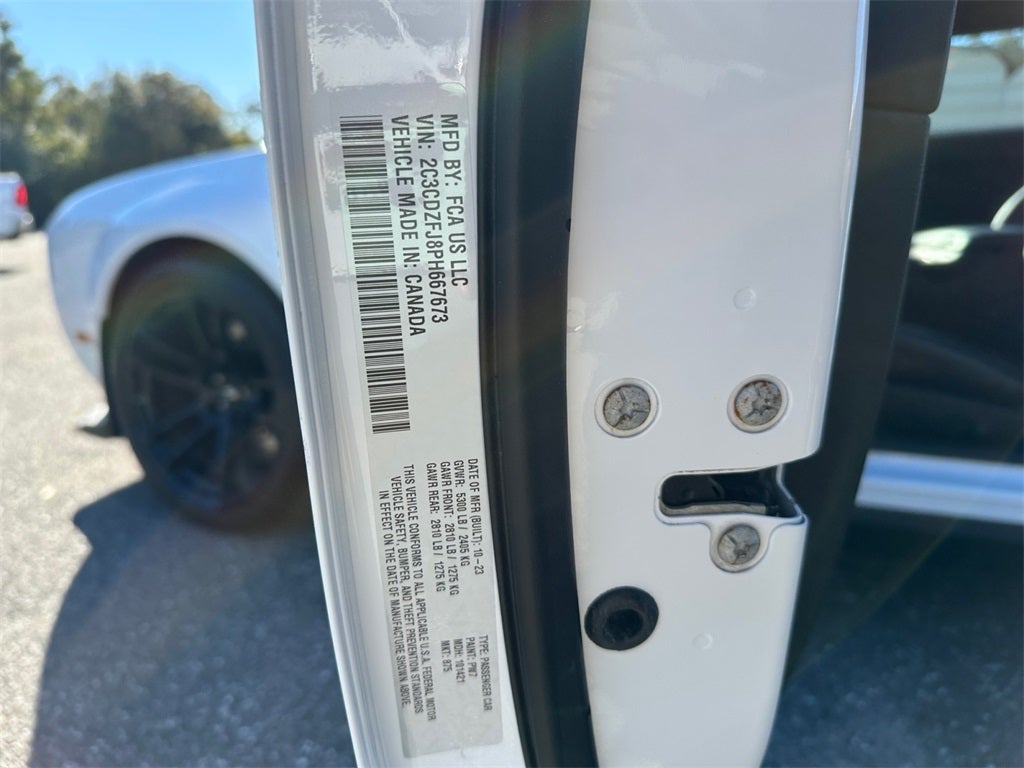 Challenger R/T Scat Pack Widebody, 2D Coupe, SRT HEMI 6.4L V8 MDS, 8-Speed Automatic, RWD, White Knuckle Clearcoat, Black Artificial Leather, 1-Yr SiriusXM Guardian Trial, 18 Speakers Premium Audio System, 4-Wheel Disc Brakes, 4G LTE Wi-Fi Hot Spot, 6 Speakers, 8.4 Touchscreen Display, ABS brakes, Adaptive Damping Suspension, Air Conditioning, Alloy wheels, AM/FM radio: SiriusXM, Anti-whiplash front head restraints, Apple CarPlay, Apple CarPlay/Android Auto, Auto High Beam Headlamp Control, Auto-dimming Rear-View mirror, Automatic temperature control, Black-Edged Premium Floormats, Body Color Exterior Mirrors, Brake assist, Brembo 6-Pot Fixed Front Caliper Brakes, Bumpers: body-color, Compass, Compass Gauge, Delay-off headlights, Driver door bin, Driver vanity mirror, Dual front impact airbags, Dual front side impact airbags, Electronic Stability Control, Emergency communication system: SiriusXM Guardian, Exterior Mirrors w/Heating Element, Flat-Bottom Steering Wheel, For Details, Visit DriveUconnect.com, For More Info, Call 800-643-2112, Four wheel independent suspension, Front anti-roll bar, Front Bucket Seats, Front Center Armrest, Front dual zone A/C, Front fog lights, Front License Plate Bracket, Front reading lights, Fully automatic headlights, Garage door transmitter, Google Android Auto, GPS Antenna Input, harman/kardon Audio Group w/Subwoofer, harman/kardon GreenEdge Amp, HD Radio, Heated door mirrors, Heated Front Seats, Heated Steering Wheel, High-Intensity Discharge Headlamps, Houndstooth Cloth Performance Seats, Illuminated entry, Integrated Center Stack Radio, Integrated Voice Command w/Bluetooth®, Leather Shift Knob, Low tire pressure warning, Media Hub (2 USB, AUX), Outside temperature display, Overhead airbag, Overhead console, Panic alarm, ParkView Rear Back-Up Camera, Passenger door bin, Passenger vanity mirror, Performance Shift Indicator, Plus Package, Power door mirrors, Power driver seat, Power Multi-Function Foldaway Mirrors, Power steering, Power Sunroof, Power Tilt/Telescope Steering Column, Power windows, Premium-Stitched Dash Panel, Quick Order Package 24N R/T Scat Pack Widebody, Radio data system, Radio: Uconnect 4C w/8.4 Display, Radio/Driver Seat/Mirrors Memory, Rain Sensitive Windshield Wipers, Rear anti-roll bar, Rear reading lights, Rear seat center armrest, Rear window defroster, Remote keyless entry, Rhombi 2-Pc Wheel Center Cap, Scat Pack Logo Nappa/Alcantara Seat, Security system, Shark Fin Antenna, SiriusXM Radio Service, SiriusXM Satellite Radio, Speed control, Speed-sensing steering, Split folding rear seat, Spoiler, Sport steering wheel, Steering wheel mounted audio controls, Surround Sound, Tachometer, Technology Group (DISC), Telescoping steering wheel, Tilt steering wheel, Traction control, Trip computer, Trunk Mounted Subwoofer, USB Host Flip, Variably intermittent wipers, Ventilated Front Seats, Wheels: 20 x 11.0 Carbon Black Aluminum, Wheels: 20 x 9.0 Lo Gloss Granite Crystal, Widebody Competition Suspension, Widebody Fender Flares, Challenger R/T Scat Pack Widebody, 2D Coupe, SRT HEMI 6.4L V8 MDS, 8-Speed Automatic, RWD, White Knuckle Clearcoat, Black Artificial Leather.