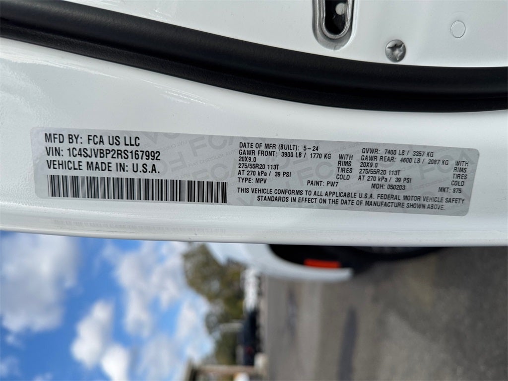 Quick Order Package 25J, Wagoneer Series II, 4D Sport Utility, 3.0L I6, 8-Speed Automatic, 4WD, Bright White Clearcoat, Black Leather, 10 Speakers, 118 MPH Maximum Speed Calibration, 3.55 Rear Axle Ratio, 3rd row seats: bench, 4-Wheel Disc Brakes, ABS brakes, Adjustable pedals, Air Conditioning, Alloy wheels, AM/FM radio: SiriusXM with 360L, Anti-whiplash front head restraints, Apple CarPlay/Android Auto, Audio memory, Auto-dimming door mirrors, Auto-dimming Rear-View mirror, Auto-leveling suspension, Automatic temperature control, Brake assist, Bumpers: body-color, Compass, Delay-off headlights, Driver door bin, Driver vanity mirror, Driver's Seat Mounted Armrest, Dual front impact airbags, Dual front side impact airbags, Electronic Stability Control, Emergency communication system: Wagoneer Connect, Exterior Parking Camera Rear, Four wheel independent suspension, Front anti-roll bar, Front Bucket Seats, Front Center Armrest w/Storage, Front dual zone A/C, Front fog lights, Front reading lights, Fully automatic headlights, Garage door transmitter, Genuine wood console insert, Genuine wood dashboard insert, Genuine wood door panel insert, Heated door mirrors, Heated front seats, Heated rear seats, Heated steering wheel, Illuminated entry, Knee airbag, Leather Trimmed Bucket Seats, Low tire pressure warning, Memory
